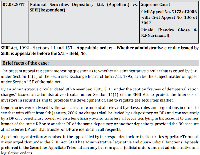 - SEBI appeal allowed as preliminary objection is sustained and NSDL's dismissed with setting aside SAT orders.